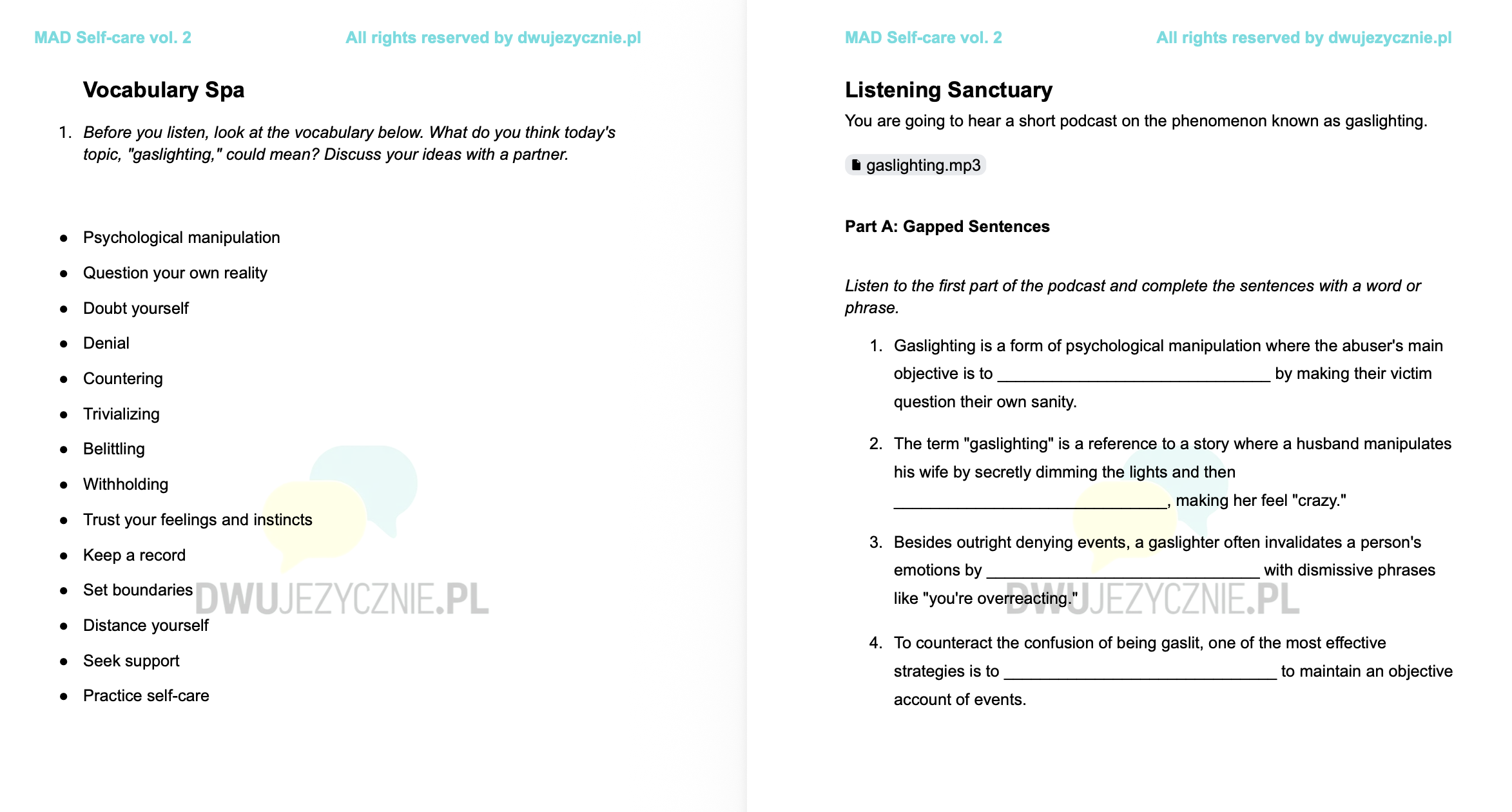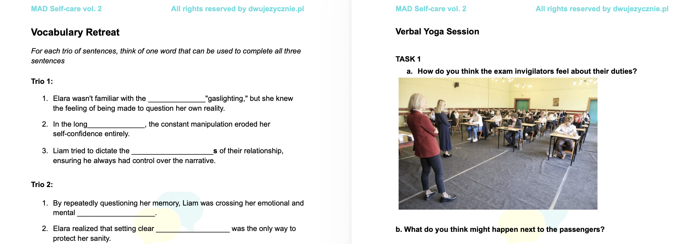 AND: themed transformations, trios and MAD writing tasks, all of them relate to an interesting self-help topic eg. gaslighting the impostor syndrome  and the phenomenon of self-bullying.